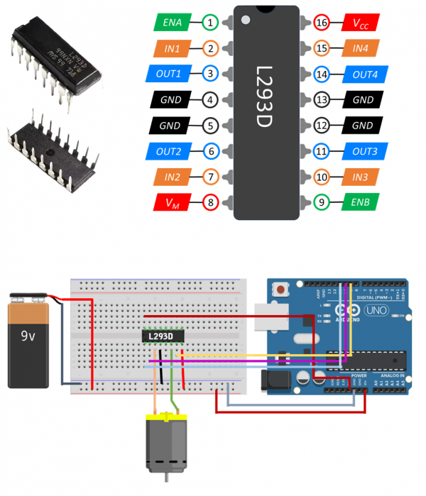 ■ L293D는 아두이노에서 모터를 구동하기 위해 널리 사용되는 듀얼 모터 드라이버 IC 이다.